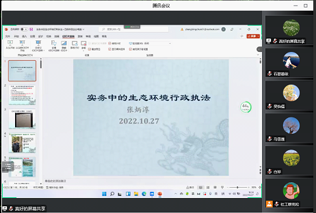 10月27日我院邀请到了西安市人大法工委张炳淳主任于下午16:40-18:30在线上开展了《实务中的生态环境行政执法》实务大讲堂线上专题讲座,张炳淳主任是我校八六级校友、武汉大学法学博士,曾担任西安市生态环境局副局长、西北政法大学环境与资源保护法教研室主任、教授、环境与资源保护法学硕士研究生导师组长,拥有丰富的理论和实务经验。马雪莲副院长主持讲座。