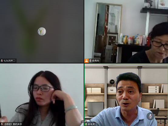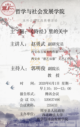 为了更好地配合专业课程的学习,加深同学们对中华优秀传统文化的理解,西瓜直播 与周至县人民政府在签约合作共建“中华传统文化”教学实践基地的基础上,2020年6月1日上午,借助腾讯会议平台共同举办了题为“《诗经》里的关中人”云端实践教学活动。实践教学活动由周至县人民政府委托周至县文化局副研究员赵永武先生主讲,西瓜直播 副院长郭明俊教授主持,特邀嘉宾刘亚玲研究馆员和学院部分教师以及哲学专业学生参加此次活动。