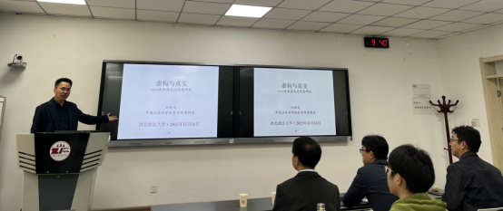 在学术讲座环节,刘新文教授以“虚构与真实”为主题,以金岳霖先生的“样式”概念为切入点,系统阐述了“虚构中的真”这一哲学命题。他指出,真理性并非事物本身的性质,而是命题与客观实在之间的一种“符合”关系。在文学艺术特别是小说创作中,“真”体现为作品所呈现的“样式”是否恰切地表达出“人的本性”这一概念整体。他借助“真的宋画”等案例,从逻辑结构上分析了“小说之真”的命题形式。整场讲座论证详尽,引经据典,逻辑严密。