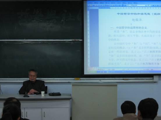 院长张周志教授主持了讲座。 赵馥洁教授首先谈到,大学应该是学术胜地,大学的老师应该有学术旨趣,大学生应该有学术热情。他对到场的同学和老师寄予期望,希望他们能维护好大学的学术净土,建设好学术殿堂。 赵教授谈到,“贵人”思想和“贵和”思想是中国哲学两个很重要的思想。而他今天主要讲了中国传统哲学中的和谐思想。赵教授的报告从四个方面展开。 第一,中国哲学和谐思想的含义。所谓“和”就是事物各种不同的要素相互协调、相互适应、相互平衡、从而共处于一个统一体中的状态。赵教授谈到,要理解“和”这个概念,就必须注意三点:首先,“和”是多样性的协调;其次,“和”是一个统一的机体;最后,“和”是一个协调的状态。只有注重了“多”、“一”、“协调”这三点,才能深刻理解“和”这个概念。在中国传统哲学中,与“和”相对的概念是“争”,争是有“多”却没有“一”,正像孔子说的:“君子矜而不争,群而不党”,老子所说的:“水善利万物而不争”。另外一个与“和”相关的概念是“同”,“同”就是单一要素的不断重复,孔子也说:“君子和而不同”。通过与这两个概念的比较就能很确切地理解“和”。赵教授谈到,在中国哲学史上有一个和“和”相通的概念就是“中”,“中”是实现“和”的条件,“和”是各因素处于“中”的结果,所以儒家讲究“致中和”。 第二,中国传统和谐思想的形成。赵教授讲到,中国传统和谐思想大约形成于春秋时期(前771—前481年)。在公元前八世纪到六世纪,曾将有过两次关于“和”与“同”的讨论,第一次是公元前774年史伯和郑桓公的对话,另外一次是公元前522年齐景公和晏子的对话。这两次讨论为中国和谐思想奠定了基础。但是真正将和谐思想上升到哲学层次的是孔子对“和”的阐发。孔子(前551—前479)在讲学中明确论述了和的重大意义,孔子说,“君子和而不同,小人同而不和”;(《论语·子路》)孔子的学生有若说,“礼之用,和为贵,先王之道斯为美”。(《论语·学而》)“和”的思想经过孔子的阐发而成熟,而后人在不断的论述之中就形成了和的具体内容。 第三,中国哲学和谐思想的内容。赵教授报告的第三个方面就是关于“和”在各个方面、各个重要领域的表现,也就是“和”的具体内容。关于这点,赵教授共谈到了中国传统哲学中的七种哲学观。 一、宇宙和谐观。宇宙和谐观是本体论意义上的,《周易·彖辞》讲到的“保合太和”;《庄子·天运》中讲到的“太和万物”;张载在《正蒙·太和篇》中讲到的“太和所谓道”都是宇宙和谐观的体现。 二、自然和谐观。自然和谐观的核心是阴阳和谐。所以《老子》讲到“万物负阴而抱阳,冲气以为和”;《荀子·天论》中说的“阴阳大化,风雨博施,万物各得其和以生,各得其义以成”;《吕氏春秋·贵公》说“阴阳之和,不长一类,甘露时雨,不私一物,万民之主,不阿一人”。这些都是阴阳二气和谐的例子,但是老子以后的思想家更加注重“和”在社会领域的意义,并且赋予其价值意蕴。 三、天人和谐观。天人和谐观主要表现在天人合一观上。《老子》中讲“人法地,地法天,天法道,道法自然”;《易传》讲“大人者与天地合其德,与日月合其明,与四时合其序”;孟子讲“尽其心者,知其性矣,知其性则知天矣”;庄子说“天地与我并生,而万物与我为一”;张载说“天地合一存乎诚”;程颢也说“仁者与天地万物为一体”。这些论述都表达了天人合一的理想,体现出了中国传统哲学中的天人和谐观。 四、人际和谐观。赵教授讲和谐的人际关系应该是万民和睦、上下和谐、内外和谐的。 五、社会和谐观。在社会和谐观里包括了两个层次的内容,即理想的社会模式和政治和谐。理想的社会模式主要有以下几个代表:1、儒家提出的德性社会的大同理想;2、墨家提出的爱利乐园;3、道家的至德之世;4、张载的“民胞物与”的理想。在社会和谐观上又特别重视政治和谐。比如《礼记·经解篇》就讲“发号出令而民说,谓之和”;《慎子·君人篇》讲“法之所加,各以其分蒙其赏罚,而无视于君,是以怨不生而上下和”。 六、天下和谐观。《庄子·天下》讲“古之人齐备乎!配神明,醇天地,育万物,和天下,泽及百姓”;《左传·襄公十一年》的“协和万邦”都是这一思想的体现。 七、人生和谐观。关于这点,赵教授谈到要注重心灵和谐、外貌和谐、家庭和谐、朋友和谐、待人和谐、事业和谐等方面。 第四,中国哲学和谐思想的价值意蕴。赵教授谈到,从以上的分析中可以得出关于“和”的很多价值意蕴,主要的有和是道、和则生、和则一、和则强、和则美。 最后,赵教授还祝愿各位同学有个和谐的人生、祝福社会和谐、世界和谐。其对现实的关怀也溢于言表。 接着,进行了师生互动环节。赵教授对同学提出的问题都给与解答,其妙语常常博得同学的掌声。正常报告秩序良好,赵教授热情洋溢,认真严肃,给同学留下了极好的印象。 西瓜直播