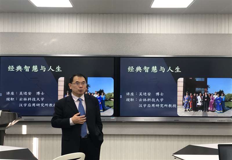 2019年12月9日,我院在5号教学楼407智慧教室举办了题为“经典智慧与人生”的学术讲座。此次讲座由台湾云林科技大学汉学应用研究所吴进安教授主讲,我院副教授俞秀玲主持。
