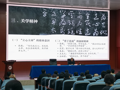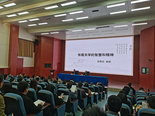 10月27日晚19:00,由西瓜直播 主办的“纪念关学宗师张载诞辰1000周年”系列学术报告首场讲座在我校雁塔校区人权研究院报告厅举行。本次讲座由我校资深教授赵馥洁先生主讲,副校长张荣刚教授主持,西瓜直播 院长山小琪教授、副院长郭明俊教授、中国哲学硕士生导师组组长李明教授、中国哲学教研室主任俞秀玲副教授等教师及校内外学生参与了此次讲座。