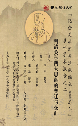 近年来,赵馥洁教授带领我校中、青年学术团队在关学研究方面凸显了关学所独具的价值论意蕴,取得了诸多研究成果。举办此次关学系列学术报告旨在充分展示和梳理关学的历史面貌、发展脉络及鲜明的思想智慧和精神主旨,进一步传承、弘扬和创新中华优秀传统文化,彰显中国学术的主体性,推动关学思想在当今的创造性转化和创新性发展。首场报告会后还将由李明教授、俞秀玲副教授、李智福副教授、马亚雄博士和张磊博士分别进行三场学术报告,围绕关学研究与中国哲学开展交流研讨。