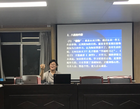 俞秀玲副教授围绕《大学》阐述了其由来、结构和地位,将其智慧归结为“三纲领”“八条目”,并对其内涵和内在逻辑进行详细论说。她指出,《大学》“修齐治平”的个人理想反映了“家”与“国”之间的同质联系,它将国家、社会、家庭和个人串联成一个密不可分的整体,并衍生出了一套独特的生活方式和价值思维,即“家国情怀”。“家国情怀”不仅是公民意识积累的结果,还是一种精神气脉,更是中华民族精神的本源。它是每个中华儿女不可缺少的基因。在当今社会,实现中华传统美德的创造性转化与创新性发展,都必须以塑造和弘扬新时代的家国情怀作为根基,而以个人、社会、国家三个层面构建起来的“社会主义核心价值观”很好地继承和发挥了“家国一体”的理念,也为传统“家国情怀”意识的传承和创新提供了现代化的样本。