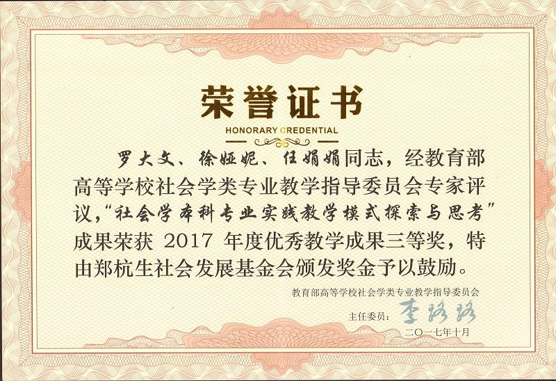 我院教师罗大文、徐雅妮、任娟娟同志完成的陕西省高等教育教学改革研究项目“社会学实践教学模式的研究与实践”一文,经教育部高等学校社会学类专家评议,荣获2017年度优秀教学三等奖。特由郑杭生社会发展基金会颁发奖金予以鼓励。