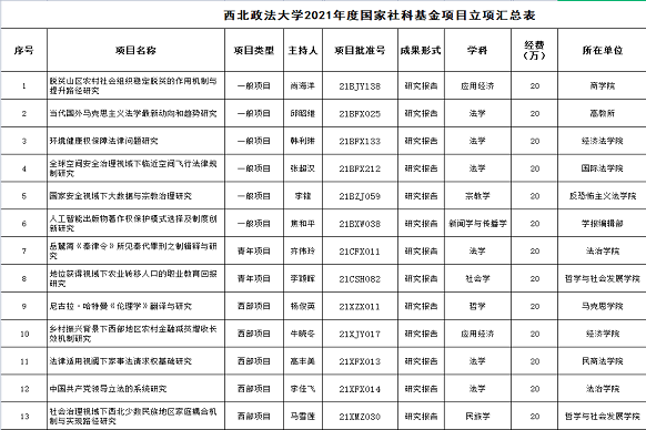 此次,国家社会科学基金项目我校共获批国家社科基金项目13项,其中一般项目6项,青年项目2项,西部项目5项。