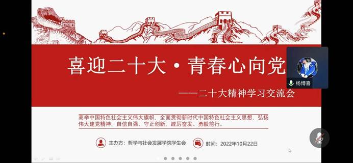 随后,参会同学积极发言,分享对二十大精神的学习体会。2020级哲学专业杨博喜同学结合自身专业,精炼地阐述了自己对二十大精神的总体感受:“党的二十大报告总揽全局、气势恢宏,思想深邃、内涵丰富,闪耀着马克思主义真理的光芒,是推动中国特色社会主义不断前进的政治宣言、理论纲领和行动指南。”随后2022级新生郭正元同学从自己和党和国家的命运联结方面表达了对自己的期望:“作为新时代的青年学生,我们更应当坚定不移地听党话,跟党走,肯吃苦,能奋斗,跟紧新时代的发展潮流,让自己的努力与建设社会主义现代化强国同频共振。”张楠同学引用了习近平总书记的话“无数人生成功的事实表明,青年时代,选择吃苦也就选择了收获,选择奉献也就选择了高尚”来鼓励同学们主动吃苦,主动磨砺,主动提升,为人生之路打下思想、知识等方面的坚实基础。