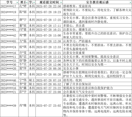 在安全教育过程中,学院深情寄语同学们,希望大家认真观看学习,时刻将安全放在首位,不仅要照顾好自己,也要常给家人报平安。同学们积极响应号召,踊跃参与到安全教育学习中。统计数据显示,4个视频共被浏览观看1807次,累计观看时长达到79小时,充分体现了同学们对安全教育的重视。同时,同学们认真思考,积极填写观后感,共提交142条观后感,表达了自己对安全知识的深刻理解和感悟。