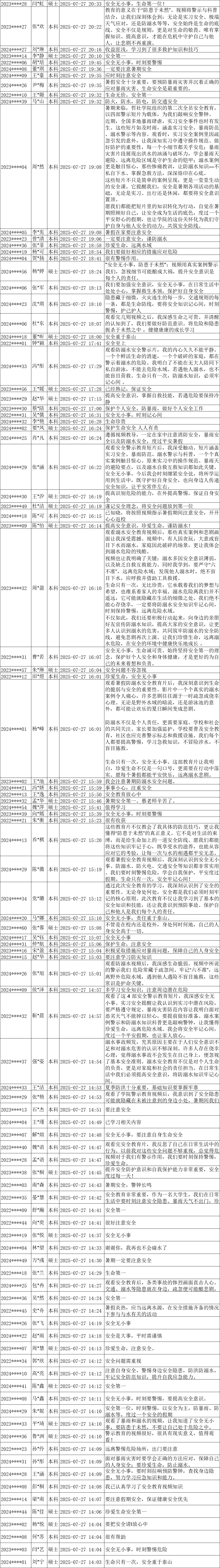 7月27日—30日,为提升学生安全防范意识与自我保护能力,西瓜直播 开展了暑期第二次全员安全教育活动,活动覆盖全体本科生、研究生。