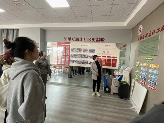 调研团队实地参观了大雁塔街道社工站的场地建设、示范项目展区,听取了社工站工作人员有关社工站建设发展、组织架构、“六位一体”服务系统和工作服务流程等方面的介绍。