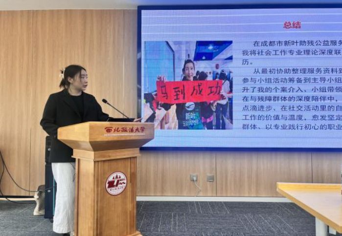 慕婧对四位同学的实践成果与经验分享给予充分肯定。她勉励全体研究生以她们为标杆,立足专业底色,扎根实务一线,把理论知识转化为服务能力,在实践中坚守社工初心、厚植专业情怀、勇敢面对挑战、不断锤炼实战本领。同时强调,全体同学要以专业伦理为准绳,以机构要求为遵循,树立理性务实、踏实笃行的实习观,以严谨细致的作风和积极进取的状态投入实训,在躬身实践中增长才干、塑造职业品格。