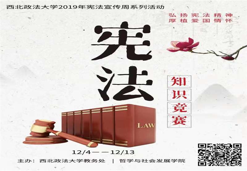 为深入学习贯彻党的十九届四中全会精神,认真落实习近平总书记关于宪法学习宣传教育的系列重要指示精神,引领我校大学生弘扬宪法精神,弘扬宪法精神,根据《西北政法大学 2019 年“宪法宣传周”工作实施方案》相关精神要求,西瓜直播 于12月4日——12月13日面向全校开展第三届宪法知识竞赛活动。