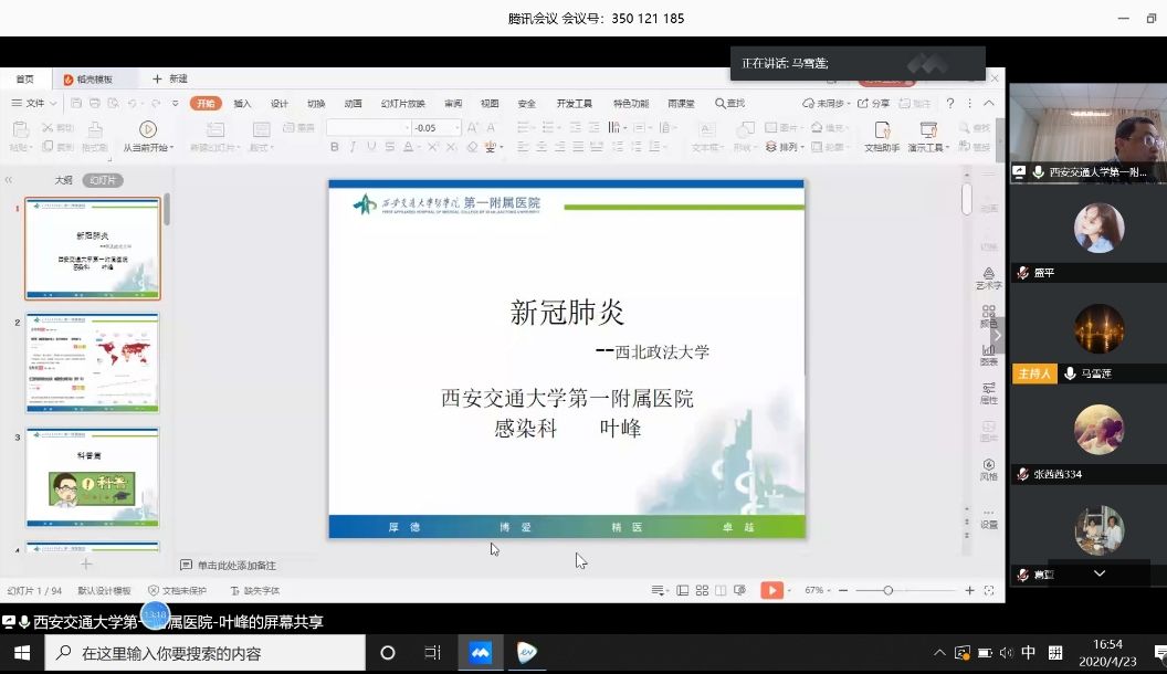 2020年初,新冠肺炎疫情猝不及防地席卷我国,全国人民上下一心,共克疫情,使国内抗疫取得显著成效,但如今疫情在全球范围内愈演愈烈,因此,我们仍不可掉以轻心。为促进同学们对传染病的了解,达到对新冠肺炎的有效预防,西瓜直播 于4月23日在线上举办了以“传染性疾病——新冠肺炎漫谈”为主题的《实务大讲堂》系列讲座。本次讲座由西安交通大学第一附属医院感染科副主任叶峰担任主讲人,我院副院长马雪莲担任主持人。