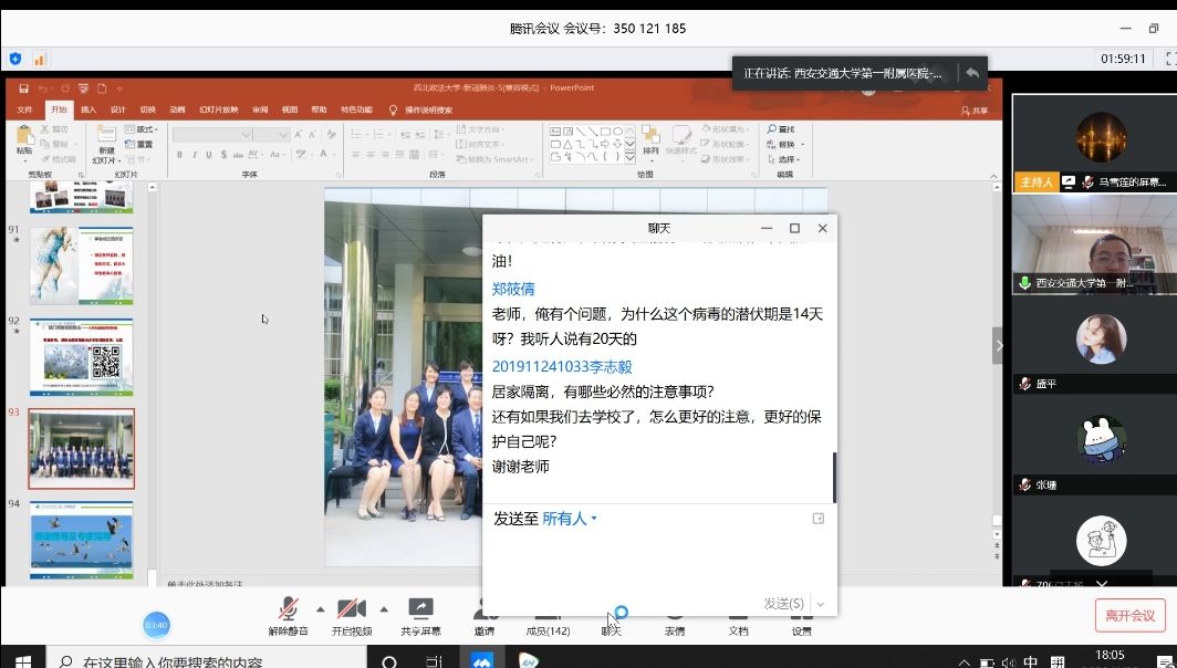 新冠肺炎是一种新发传染病,同学们对此了解还不够深入。为了使同学们对其有更深入的认识,叶峰老师从新冠肺炎的传染源、传播途径、临床表现及出院后注意事项等方面出发作了详细介绍。在这场无声的战役中,白衣战士们舍小家为大家,成为“最美逆行者”,叶老师讲述了西交大第一附属医院在疫情中的所作所为,哪怕困难重重,也毅然前行,令人肃然起敬。